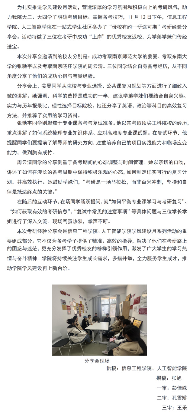 信息工程、人工智能学院在“一站式”学生社区举办“母校有约—研途可期”考研经验分享会