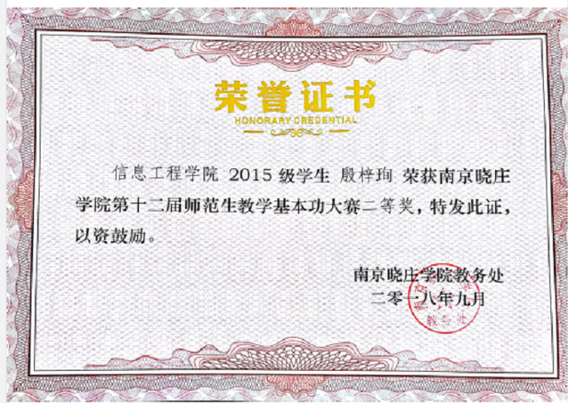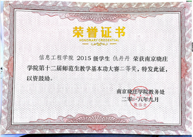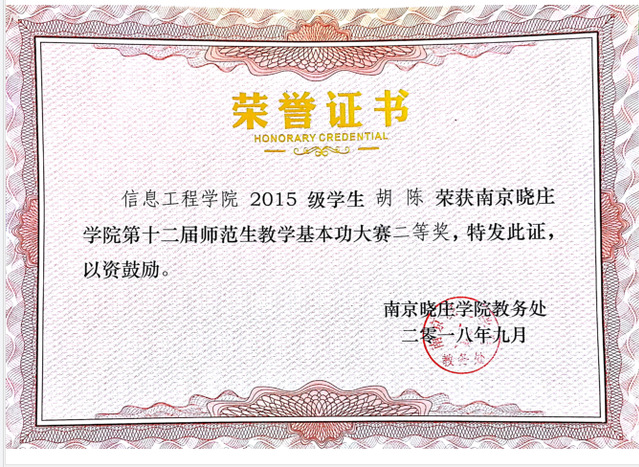 信息工程学院2015级学生参加南京晓庄学院第十二届师范生教学基本功大赛荣获佳绩,胡陈、殷梓珣、仇丹丹获二等奖、陈映恬、闵瑶、丁瑞、朱子龙、陈晨、蒋淑敏获三等奖。