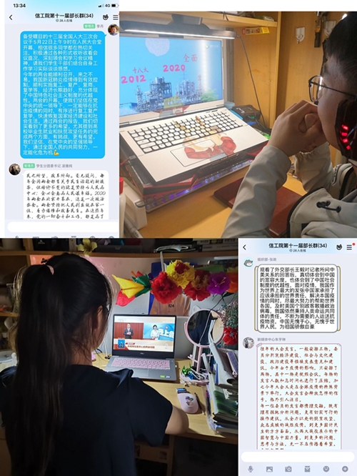 座谈会由院分团委组织部部长吴晟铭主讲,他结合PPT介绍了此次两会会议精神并带领我们观看了2020年全国两会闭幕式。座谈会期间,学生干部们认真学习,专心聆听有关全国两会的内容。吴晟铭同学表示:“这既是落幕,也是启程。面对新冠这个史上罕见的重大突发公共卫生事件,中国能够迅速控制疫情离不开党中央的正确领导,更离不开无数中国人的齐心协力。作为新时代的大学生,我们更应该脚踏实地,齐心渡难关。”最后,组织部副部长张政强调,“中国一直以来都是一个强大的国家,新冠肺炎虽来势汹汹,但我们毫不畏惧。作为一名学生干部,拥有双重身份的我们更应该坚定意志、砥砺前行!”