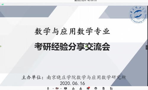 2020年6月16日,南京晓庄学院数学与应用数学研究所以线上形式召开了数学与应用数学(师范)专业考研经验分享交流会,数学与应用数学研究所所长任艳丽教授、信息工程学院王勇副院长出席并讲话,2020届数学与应用数学(师范)专业考取硕士研究生的7名同学作了经验分享交流,数学与应用数学(师范)专业17级学生及部分18级、19级学生共七十余人参会。