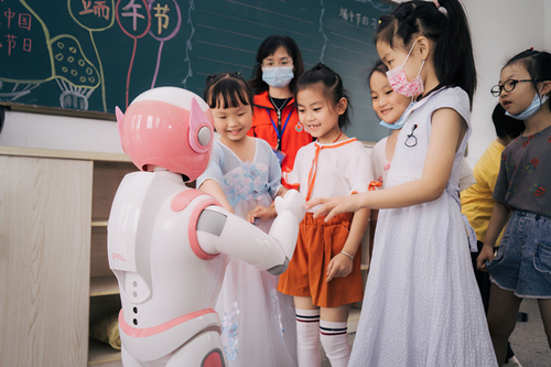 孩子们与i宝机器人亲密互动