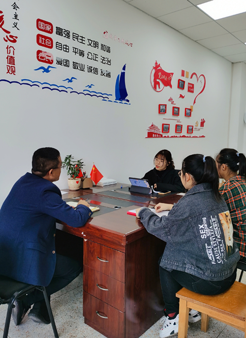 支部书记与学生党员在工作室内进行工作讨论