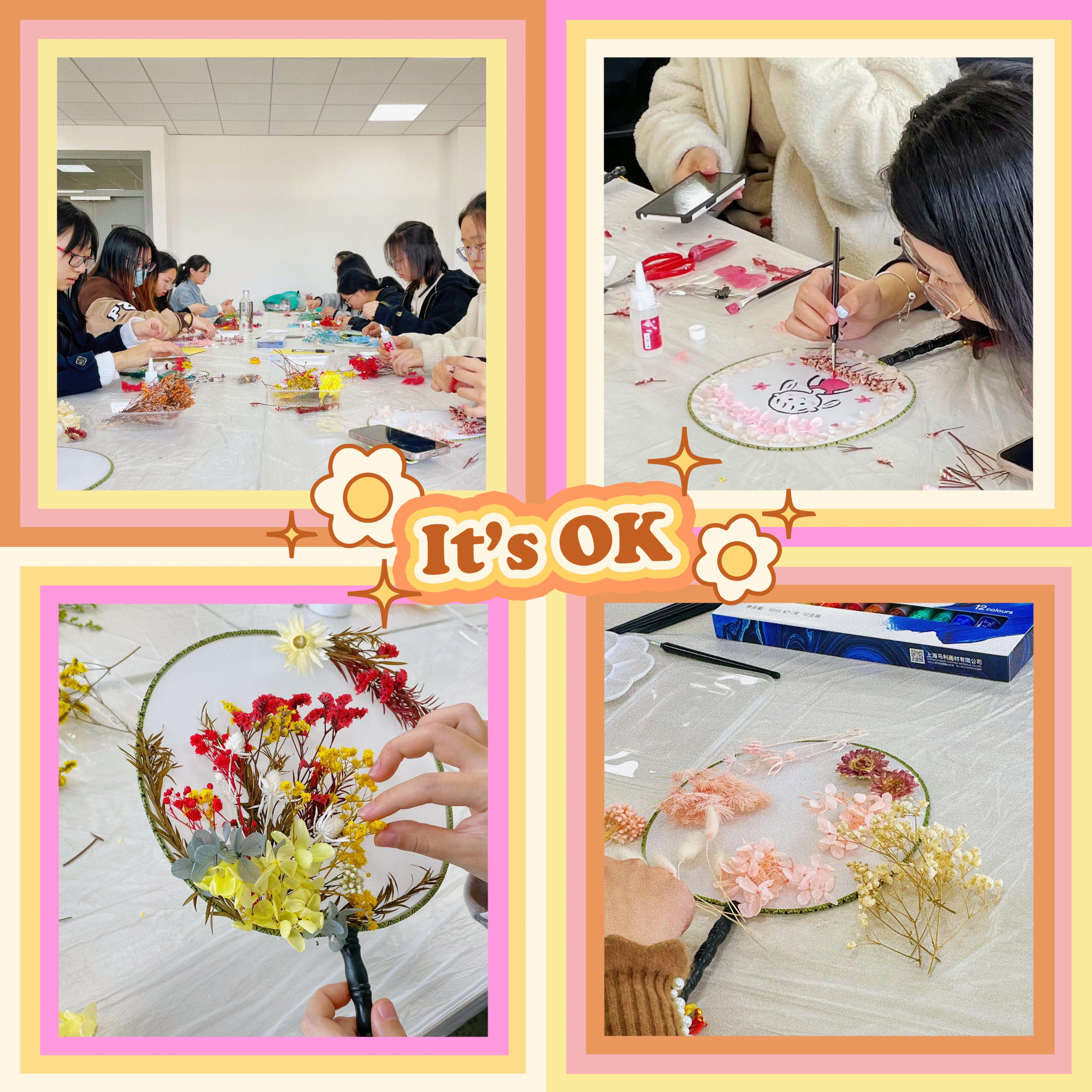 活动伊始,同学们通过观看晓庄杰出女性代表的视频及讲解,深刻感受到了晓庄建设中的女性力量。在这种力量的感召下,同学们以积极饱满的热情投入到非遗文化手工制作环节:调配颜料,勾勒图案,一条条色彩鲜艳、创新大胆的水拓画丝巾由此诞生;创意构图,细心描摹,一柄柄各具特色、意蕴丰富的干花团扇呈现在我们眼前。