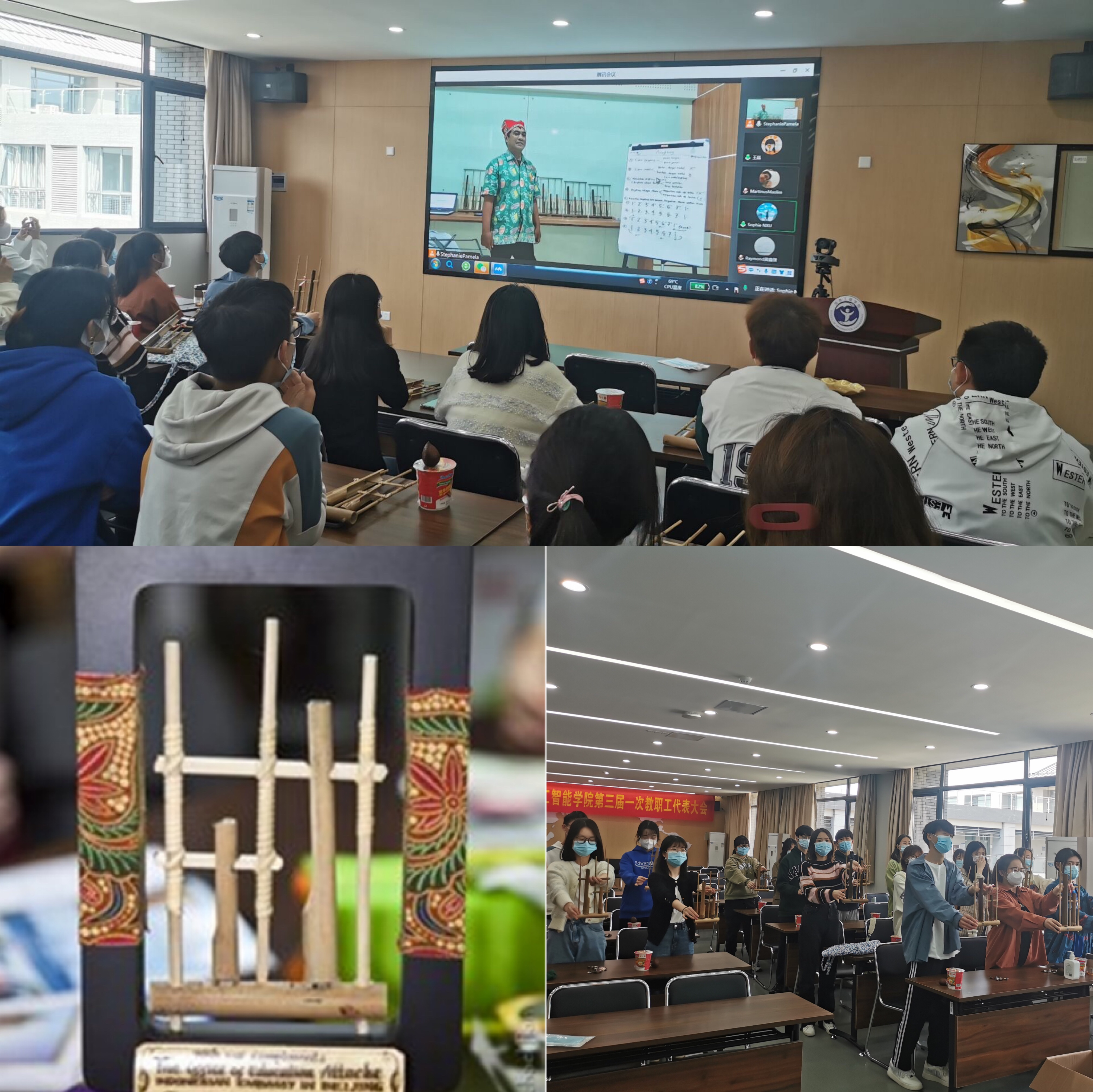 在第一堂课中,中外师生通过线上讲解、观看视频、现场演示,学习印尼传统竹筒乐器——昂格隆(印尼语Angklung)的演奏。昂格隆被联合国教科文组织列为世界非物质文化遗产,其演奏融合了团队精神,是乐师在海外必演的节目,更是印尼人招待来宾、主客同乐的压轴节目。经过近两个小时的学习,同学们用昂格隆演奏了《生日歌》,献上对建校95周年的祝福。此外,学院王晶老师还特地为同学们带来了印尼特色水果和特色美食,让同学们多方面深入了解印尼。