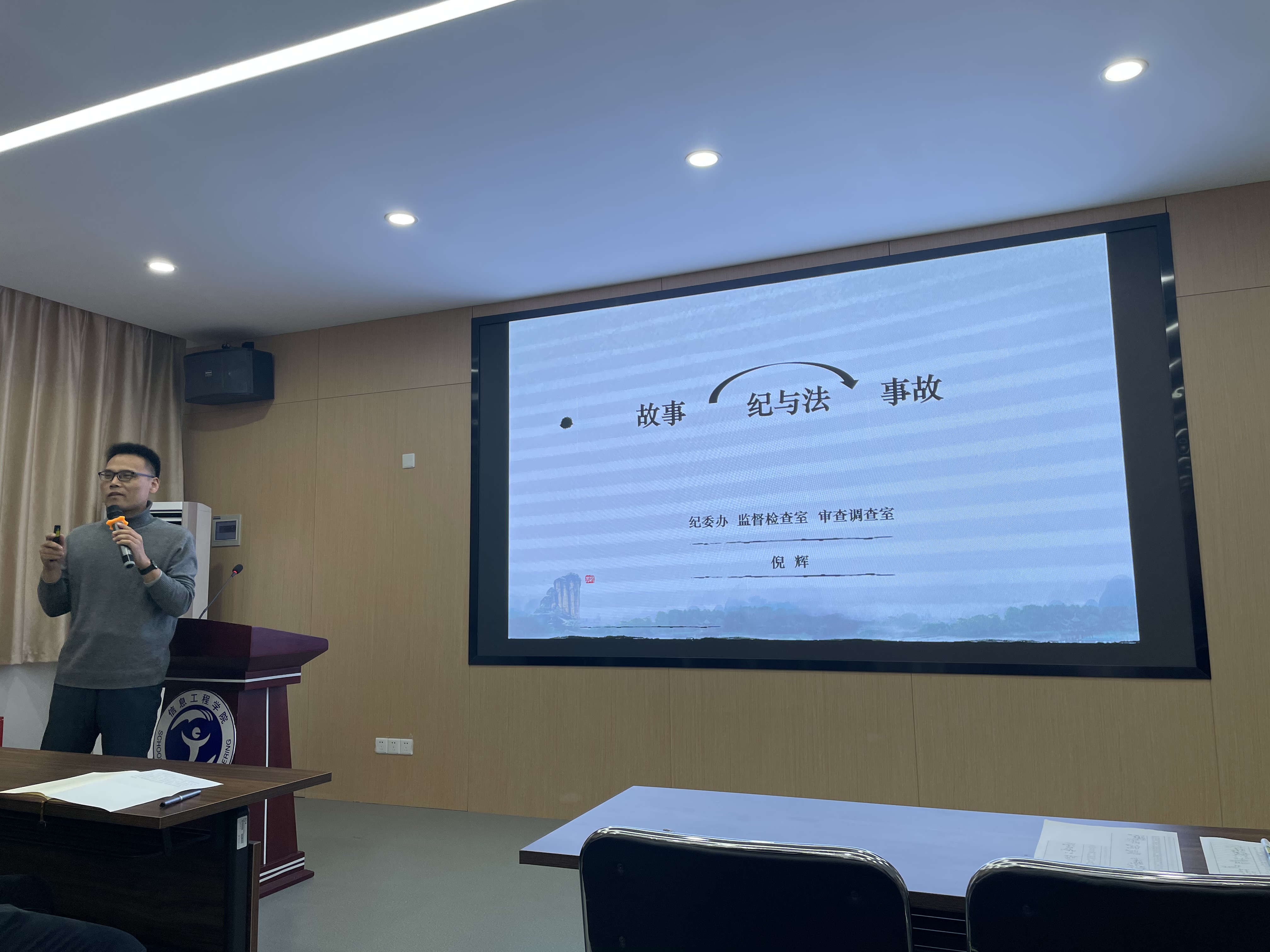 为进一步巩固深化“不忘初心、牢记使命”主题教育成果,认真落实习近平总书记关于意识形态工作的重要讲话精神,持续增强党员领导干部、教职工团体廉洁奉公意识和慎独自律能力,时刻铭记党纪党规、校纪校规、法律法规,信息工程学院邀请校纪委办、监督检查室、审查调查室负责人倪辉书记,于工科楼南511开展“纪与法——身边的几则故事”专题讲座。