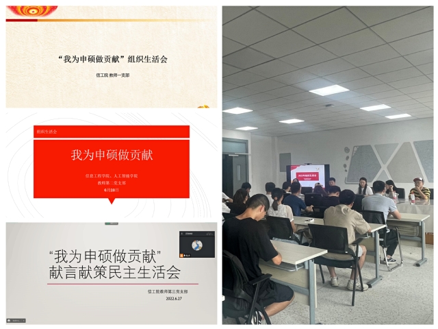 为进一步落实学校二届十次全会和全校教职工大会精神,凝聚思想共识,明确目标任务,实现党建融合业务、党建引领发展的根本目标,根据学校党委组织部通知要求,信息工程学院教师支部、学生支部自6月24日至28日,召开“我为申硕做贡献”组织生活会。