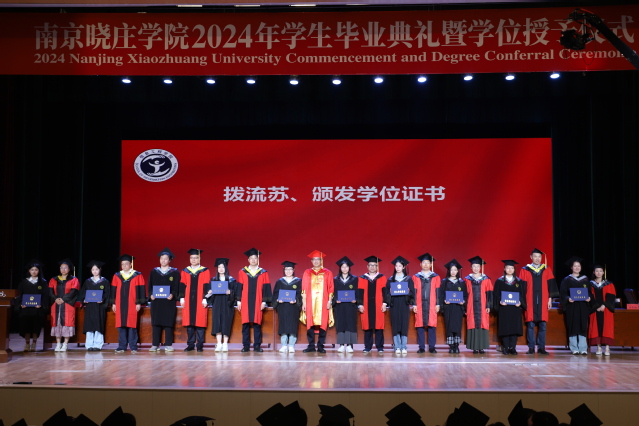 校党委副书记易永建、学院党政领导、主礼教授为全体毕业生依次颁发授予学生学位证书、拨正流苏并合影留念。